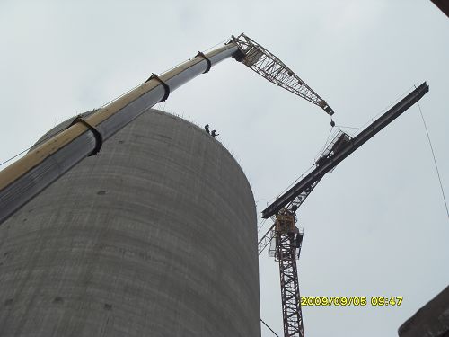 此项工程中四个水泥库子项,为该工程的核心部分,其直径为22.8米,高60米。每个水泥库顶主结构均由4根长22.6米、重9吨的钢梁组成。由于四库之间施工场地有限,其外围施工场地又有其他建筑结构,大型吊车难以就位,施工人员经过认真计算分析,结合现场实际情况,在项目部的积极配合下,精心组织,合理调度,采用了300吨汽车吊接21米副杆吊装,顺利完成吊装任务。此项工序的顺利完成,为该项工程的竣工奠定了基础。