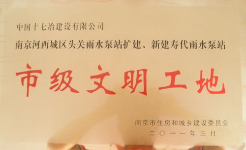 日前,由路桥工程技术公司承建的南京河西新城区头关雨水泵站扩建和新寿代雨水泵站工程,经过专家组的现场考核和南京市住房和城乡委员会的审定批准,被授予南京市2010年度“市级文明工地”荣誉称号。