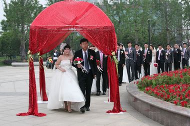 婚礼现场,一对对新人将写满爱情祝福的气球放飞天空,并在现场所有领导、嘉宾及亲朋好友的见证下交换爱情信物,深情相拥。同时,喜结连理的16对新人还受到了在场公司各界代表的美好祝福。最后,公司及团市委领导为新人们派发蜜月游的奖品,把整个婚礼活动现场推向了高潮!