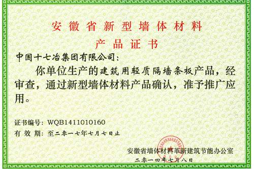 近日,由中国十七冶集团研发生产的具有自主知识产权和核心技术的绿色自保温轻质墙板,分别获得了安徽省墙体材料革新和建筑材料节能办公室和安徽省建材工业协会颁发的新型墙体材料产品证书和绿色建材产品证书。