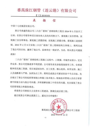 番禺珠江钢管(连云港)有限公司向公司致表扬信