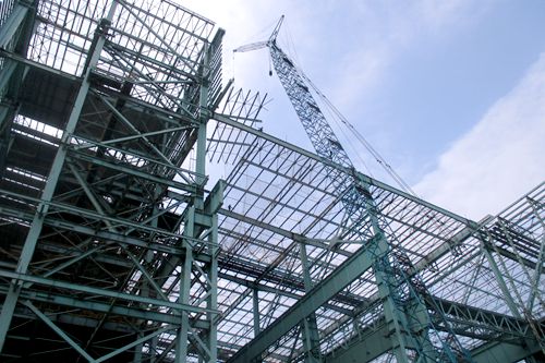 炼钢主厂房为单层排架与多层框架组成的多跨全钢结构厂房,南北向总长度458m,东西向总长度153m,厂房顶部标高为70.5m。炼钢主厂房一步工程于2014年5月18日开始安装,二步工程于2014年12月16日开始安装。