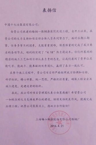 4月21日上午,上海梅山钢铁股份有限公司炼钢厂向中国十七冶集团发来表扬信,表扬冶金工程技术公司在梅钢一炼钢渣滚筒项目面对各种不利因素,如期完成热负荷的出色表现。