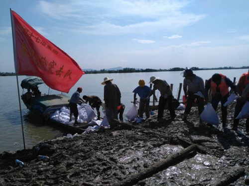 76上午开始,中冶置业(安徽)公司成立“抗洪抢险突击队”和“党员突击队”,60名队员分两组24小时在博望区斧山村值班,配合区防汛指挥部坚守河堤。77中午12:00博望区花津村水位12.78,超过历史最高水位0.5830名抗洪抢险突击队队员来到运粮河与姑溪河交界处,排成人墙搬运沙袋和石子,加固洼地,为6万亩良田护堤。