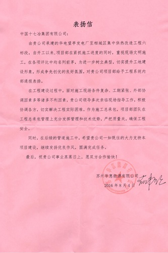 84日,苏州华惠能源有限公司向中国十七冶集团有限公司发来表扬信,对工业建筑分公司苏州华电望亭发电厂至相城区集中供热改造项目部在工程建设中做出的成绩和贡献予以赞扬。