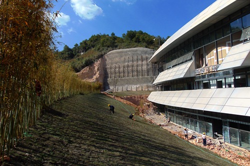 大健康工程处于山区,工程施工需进行大量的山体开挖及支护,因场地限制,边坡高度高、坡度陡,部分区域甚至垂直开挖。根据山体的开挖形式,项目施工过程中采取了多种支护方式,抗滑桩、格构、锚杆、锚索等。项目部通过科学组织,方案优化,对超深大截面矩形抗滑桩施工、高边坡施工等进行了技术攻关,并在实际施工过程中取得了良好成效。项目部同时因地制宜针对防水工程全部采用自粘型橡胶沥青防水卷材,可防止渗漏、窜流现象,基层变形时可通过自粘层位移和厚度变化,缓释、吸收基层应力,解决卷材满粘法施工的零开裂,达到空铺法施工卷材的效果,目前整个工程自粘型橡胶沥青防水卷材施工面积已超过20万平方米。
