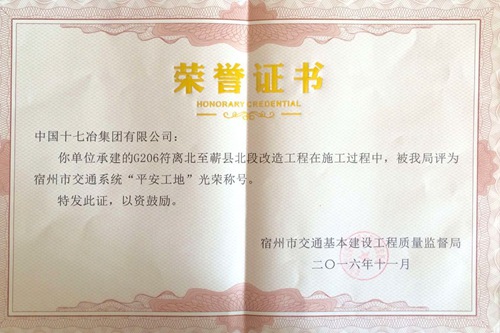 1111日,从宿州市交通基本建设工程质量监督局传来喜讯,由中国十七冶集团路桥工程技术公司承建的宿州G206符离北至蕲县北段改造工程项目荣获宿州市交通系统“平安工地”光荣称号,进一步树立了公司在宿州市场的良好形象。