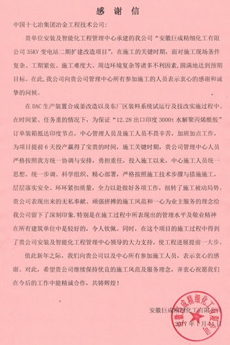1月11日,由中国十七冶集团冶金工程技术公司收到业主单位发来的感谢信,对公司承建的安徽巨成精细化工有限公司35KV变电站二期扩建改造项目顺利完成各阶段的工期及重要节点目标表示感谢。