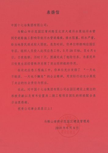 68日,马鞍山南部示范园区建设管理局向中国十七冶集团致表扬信,表扬十七冶常韦安置房二期工程项目部积极响应园区号召,勇担社会责任,在应急抢险施工中发挥了突出作用。