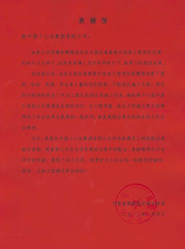 1月4日,河南省鄢陵县交通运输局向中国十七冶集团发来表扬信,对中国十七冶集团有限公司交通工程技术分公司鄢陵县老花木园区道路提升改造工程项目部在项目建设过程中的敬业、奉献精神及所做出的贡献表示感谢。
