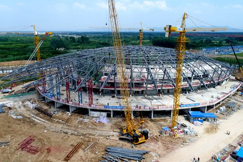 滁州高教科创城文体中心工程是滁州市重点项目,位于滁州市南谯新区乌衣镇内,区域位置位优越,交通便捷,其中手球馆将在2019年举行世界手球大赛,其主要供城市内市民健身活动使用,兼顾承接大型体育赛事。整个项目主要包含体育比赛、全民健身、体育配套、文化娱乐等多种功能。手球馆内根据功能划分为比赛馆、训练馆、观众休息厅和设备间,建筑高度29.47m,平面尺寸164m×120m,屋盖钢结构体系复杂,由弦支穹顶结构、张悬梁、异型三角环桁架、悬挑桁架组成,其中弦支穹顶区域最大跨度为78m,悬挑桁架最大悬挑为33m。项目施工工期紧,任务重,为满足精装修进度需求,项目部面对压力迎难而上,全面梳理所有子项进展情况及进度计划,倒排工期,将计划分解到每个月,细化落实到每一周、每一天,确立实施方案,定责到人。项目部还发起“大干100天,确保手球馆钢结构交付精装修”劳动竞赛,在管理全过程中跟踪到每一米钢管,落实到每一榀构件,全过程跟踪到位,从而顺利完成手球馆屋盖钢结构安装。