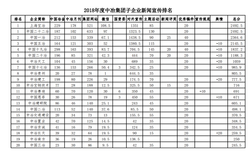 2018年度中冶集团子企业新闻宣传排名