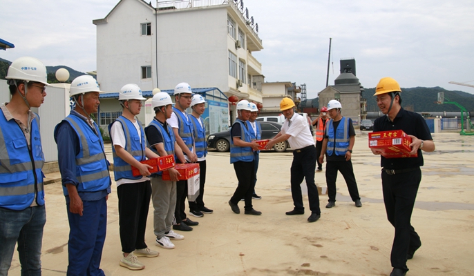 6月9日下午,安徽海螺集团副总经理万涌、海螺集团江西区域主任、弋阳海螺水泥有限公司总经理李国友一行来到中国十七冶集团房屋分公司弋阳海螺项目部,给仍奋战在建设一线的项目部管理人员及作业人员送来关爱和丝丝清凉。