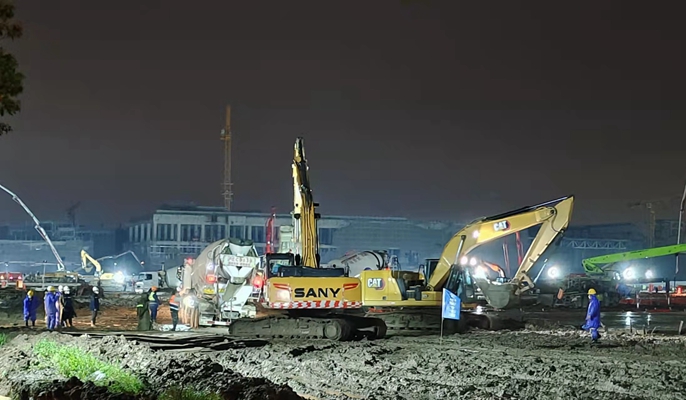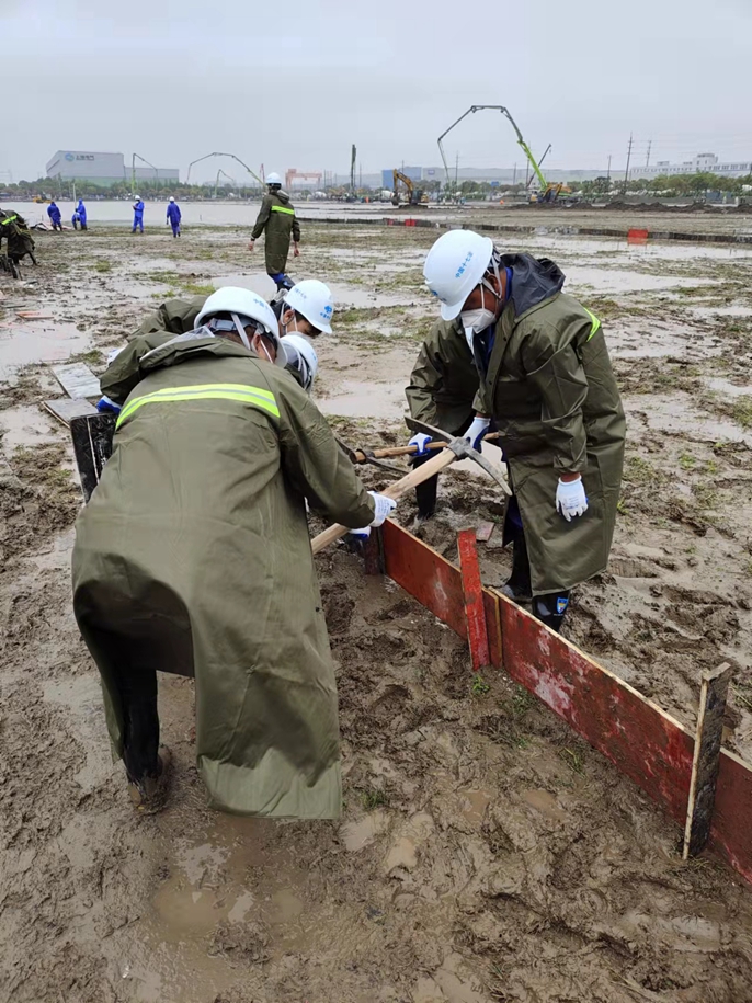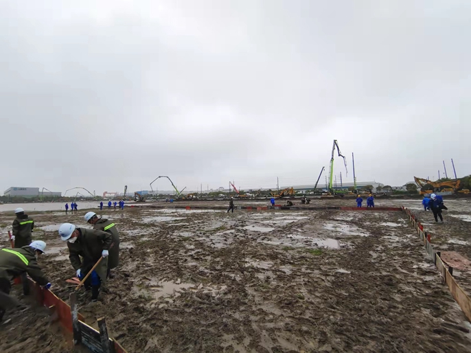 公司以项目管理部副部长吴民、安监部副部长魏宁为代表的党员骨干,从马鞍山本部陆续集结100余人作业力量,全体完成核酸检测后于4月13日下午17时增援上海。次日上午8:30分左右,十七冶首批援建队伍达到现场,旋即成立党员突击队、党员先锋队,勇担全体建设者的“主心骨”。工作组立即部署工作任务,马不停蹄投入施工。截止4月14日晚,现场累计投入施工力量300余人,推土机、压路机、挖掘机、吊车、汽车泵等施工机械44台,运输车辆20余台,混凝土搅拌车数十辆。机器沸腾轰鸣、人流穿梭不息,还有沙哑着嗓子互相鼓劲声,正不断注入“静态”下的上海“动能”。建设者们不畏艰险、不知疲倦,与疫魔争分夺秒,浇筑混凝土1000立方米,土地平整27000平方米。为了给建成交付多争取一秒时间,冒雨入场300余人的“急行军”抢先施工。当天夜里,周金龙副总经理带领工作组连夜优化施工组织,制定应对现场积水、加快作业面赶工措施。