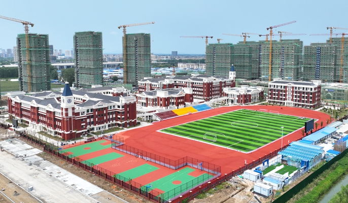 在基础施工过程中,技术人员采用空桩施工、分仓开挖,实现桩基与土方同步穿插施工,地库采用了筏板、侧墙、顶板一体化跳仓法施工,实现了地库多板块同步施工,有效缩短了工期。九年一贯制学校外墙保温使用了新型环保材料泡沫玻璃保温板,较传统保温材料相比,隔热保温性能、隔音性能提高30%,显著提高教室环境舒适度。项目部积极优化学校装修设计,将原设计3万平方米的水磨石地面改为PVC地板,节省了约30天工期,同时避免了水磨石工艺易空鼓开裂的质量风险和水磨石施工带来的污染。一系列新举措的实施,学校仅用3个月完成主体结构工程并一次性通过验收,确保顺利实现今年9月开学的建设目标。项目地下车库底板及顶板防水施工原设计方案为聚酯胎SBS改性沥青防水防水卷材,施工工序多,不仅影响工期,且后期易空鼓,渗漏风险大。项目优化设计方案,采用CPS-CL反应粘结型高分子膜基防水卷材,在提高防水效果的同时提高了生产效率,实现安置区地库缩短工期30天,学校地库缩短工期7天。