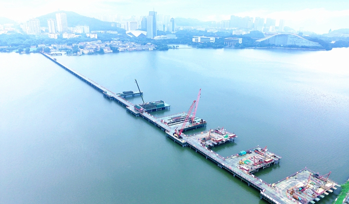 黄石段生态环境导向开发(EOD)项目涉及绿色产业3个,市政环境改造工程6个。其中湖泊综合治理工程中的磁湖绿色廊道工程是一项重要内容。该项目起于苏州路与桂林南路交叉口,向东设置桥梁跨越磁湖后在建磁湖通道延伸线,全长约1.5千米,跨磁湖大桥全长846米,大桥按照中国传统拱桥风格设计为空腹式拱叠拱桥,共17个主拱,主拱圈拱脚位于水面之上。项目团队在制定施工方案时,分析了传统技术,采用满堂支架搭设,不仅安全风险大,且拱脚处支架受空间限制,后期无法拔出。项目团队为保证承台及拱座施工质量,思考再三,改变拱桥合龙段位置,选择在拱脚前4.5米处合龙的思路,拱脚处支撑在合龙段强度达到设计强度后拆除,避免将大量建筑材料留在水体中带来的二次污染。合龙段采用补偿收缩混凝土,并提高一个标号。为确保该方案的可行性,项目部提前对大桥结构受力进行验算,编制专项施工方案,并采用BIM技术模拟施工,为拱桥施工提供技术及安全保证。