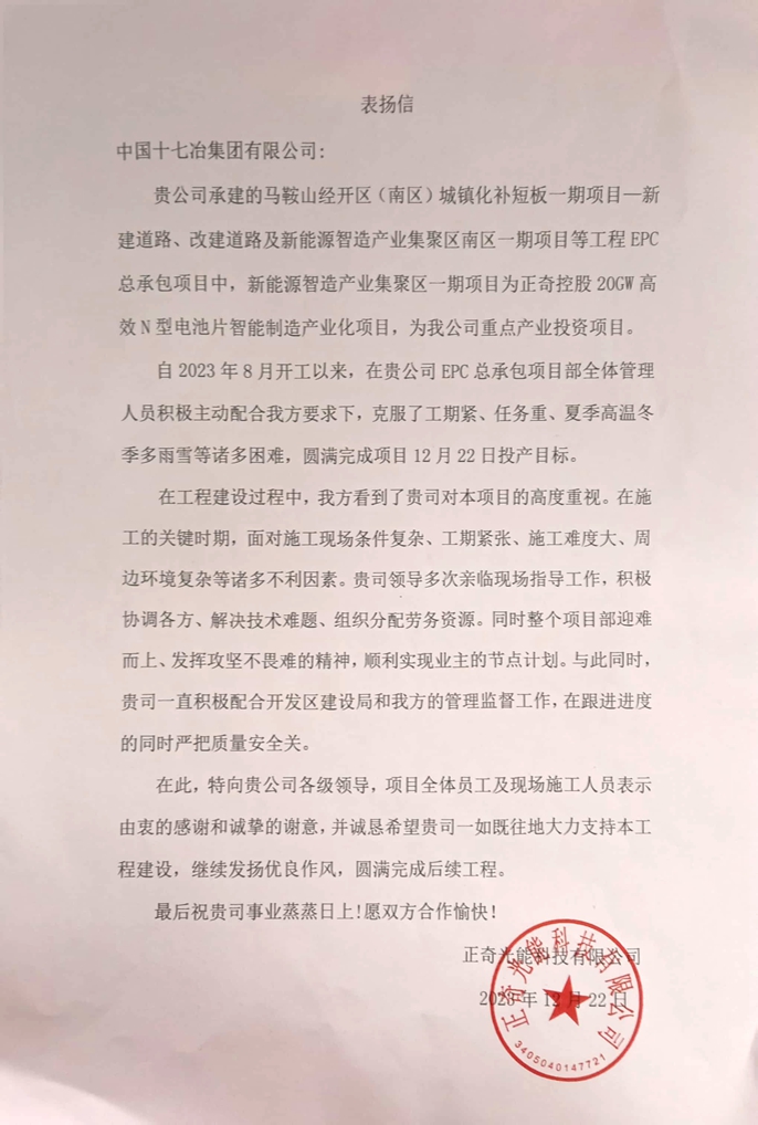 投产仪式上,正奇光能科技有限公司向中国十七冶授予“科学管理造精品工程,优质履约展央企风采”锦旗,并致表扬信。信中指出,工程建设过程中,项目团队迎难而上,攻坚克难,在积极协调各方、解决技术难题、组织分配资源的同时积极配合开发区建设局与业主管理监督,严把质量安全关,打造精品工程。