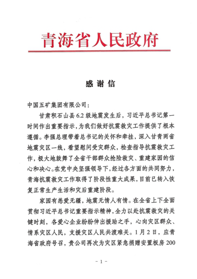 感谢信特别指出,家园有恙爱无疆,地震无情人有情。在全省上下全面贯彻习近平总书记重要指示精神,全力以赴抗震救灾的关键时刻,各爱心企业纷纷伸出援助之手,心向灾区群众、情系灾区人民,支援灾区人民共渡难关。1月2日,应青海省政府号召,公司再次为灾区紧急捐赠安置板房200套、电热毯1200套、煤炉200套、床1200套、床上用品  1200套,用心用情保障地震灾区群众安全温暖过冬,充分彰显了“一方有难,八方支援”的中国特色社会主义制度优越性,体现了国有企业高度的政治站位和责任担当。