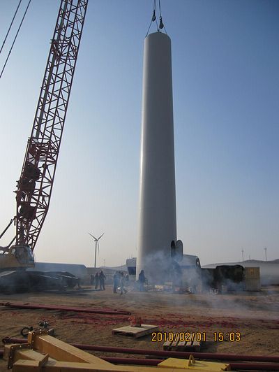 该项目施工内容包括施工道路、风机基础及十一台2MW风电机组吊装和场内输配电及通信工程,是十七冶风电工程公司第一次在蓬莱风电项目上的施工总承包。自091213日开工以来,由于蓬莱地区连降大雪,施工道路被冰雪覆盖,而且坡陡路滑,挖好的基础坑被大雪填满,这一切给施工带来极大困难。为了实现对业主的承诺,经过项目部全体人员的努力拼搏,连续施工,终于抢回了大雪延误的工期,完成了土建基础工程。首台风电机组的顺利开吊,标志着此项工程进入吊装阶段。项目部全体员工决心发扬“高效严谨,精细务实”的企业作风,高效率、高品质、高服务地干好此项工程,为十七冶风电品牌的树立作出不懈努力。