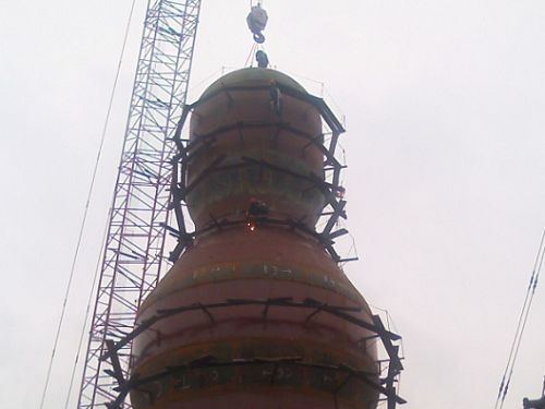 331下午518分,机电公司机装五处完成了对热风炉的最后一吊,标志着江西萍钢450m3高炉技术改造工程热风炉顺利封顶,成功地实现了3月底热风炉封顶的节点目标。