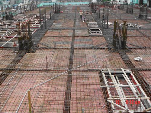 海螺大厦地下有3层,地上24层,1-9层是五星级大酒店,10-24层是综合办公楼。工程结构异常复杂,有超重、大跨度预应力现浇大梁25根,最大跨度为34.4米,大梁截面为1.5×1.6米,主要分布在2-6层。工程在这个部位砼有C15C50多种强度的要求,抗渗等级有P6P8,砼浇筑时最多一次同时有4种标号。且是无梁楼盖、下沉楼板、双层楼板和有梁楼盖结合使用;钢筋种类多、密度大,最大钢筋直径为¢32,采用直螺纹连接,每根大梁平均钢筋量达30余吨。