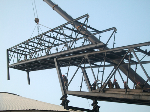 该斜拉链共两跨,重约60吨,由于该工程处于半山坡上,下临长江,上位峭壁,熟料库子项正处在江边,与其他子项存在一定的落差,导致熟料库施工场地狭小,大型安装设备很难进场,吊装难度大。为确保工程质量,该项目部精心组织,合理安排,实现了一次吊装成功,其安装质量、精度和进度均受到了业主、监理的好评。