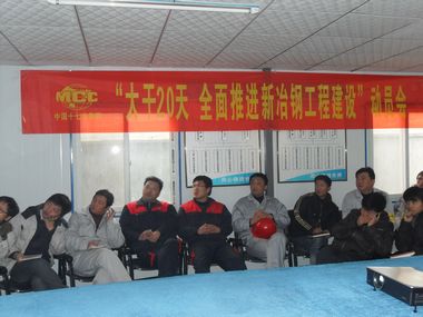 会上,督导组组长韩伟群向项目部全体员工介绍了十七冶目前发展的大好形势,鼓励大家要用大干的实际行动为企业的发展做贡献。项目部经理李春怀做了动员报告,要求全体领导人员和党员带头,带领全体员工团结一心,战严寒、斗冰雪,全面完成新冶钢项目春节前的施工进度要求。会上每位主管级以上干部做了大干20天的表态发言,每位党员进行了大干20天的岗位承诺。大家纷纷表示要克服各种困难,做好自己的本职工作,一切为现场服务,实现对业主的承诺。冶金工程技术公司党委书记周美初在会上要求项目部全体人员要责任到人,大干20天,完成项目部确定的春节前施工目标。