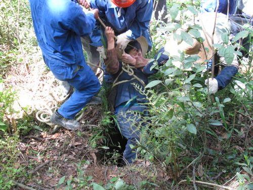 上午10时30分左右,两名当地的老妪慌慌张张跑到我公司池州海螺三期项目部求救,称她们在附近的山上采茶时,63岁的同伴王某掉入半山腰的洞穴中。容不得多想,正好在办公室的项目部副经理施阳光、质安部长苏元玉等8名同志,一边报警,一边立即组织营救。由于求救老人高度紧张,已记不清出事的具体方位。多一分钟的耽搁就多一份危险,参加营救的人员当即决定成“一”字型向山顶搜救。在离山顶10余米处的一个直径约