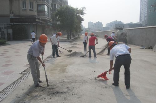 24日上午,在项目副经理程永华、总工程师杨建斌的带领下,团员青年们在安排好了各自的工作后,冒着35的高温开始了突击活动。清理过程中,大家按照分工铲的铲、凿的凿、扫的扫,并清运、洒水冲洗,干的非常卖力,任凭骄阳烈焰和汗流浃背,没有一人叫一声累和苦。为了防止大家中暑,项目部送来了饮用水和人丹,食堂还送来了绿豆汤。