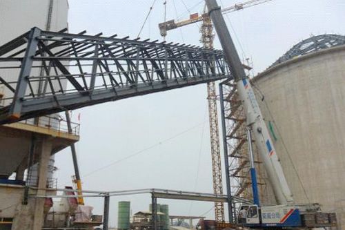 窑头斜拉链钢桁架是水泥生产线工程钢构安装的高难部位。该钢桁架分两跨设计,第一跨跨距为32.726,第二跨跨距为30.760,最高点支座标高为42.500,跨度、高度、倾角大,吊装难度系数大。因此,项目部高度重视此次吊装,精心研究了吊装方案,缜密布置吊装过程,加大人力物力投入,在地面拼装好后,采用一台220t吊车将桁架分两榀吊装到位,业主领导及项目总监也亲临现场指挥协调吊装工作,确保吊装顺利完成。