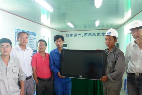越南属热带季风气候,受海陆热力差异和季风影响,从5月份开始进入雨季,气候以高温多雨为主,给施工生产带来不便。越南平阳制罐项目员工不畏酷暑,克服不利因素,奋战在各自的岗位上,工程质量、进度、安全等多次受到业主赞扬。为此,业主代表特探望了项目部一线员工,并送来清凉慰问品及一台液晶电视机。