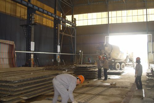 物流与装备成套公司新型绿色住宅产业化生产基地内标语醒目,彩旗招展,两个车间14台模具整齐排列。自三月下旬投入生产以来,该厂20名员工加班加点奋战在车间。为了提高生产效率,在现有人员的基础上,他们分成两个作业组,分别在两个车间展开竞赛活动,绑扎钢筋、浇注砼、蒸气养护、脱模吊装、检测检验等主要工序有条不紊,整个现场呈现出一派大干快上的喜人景象。