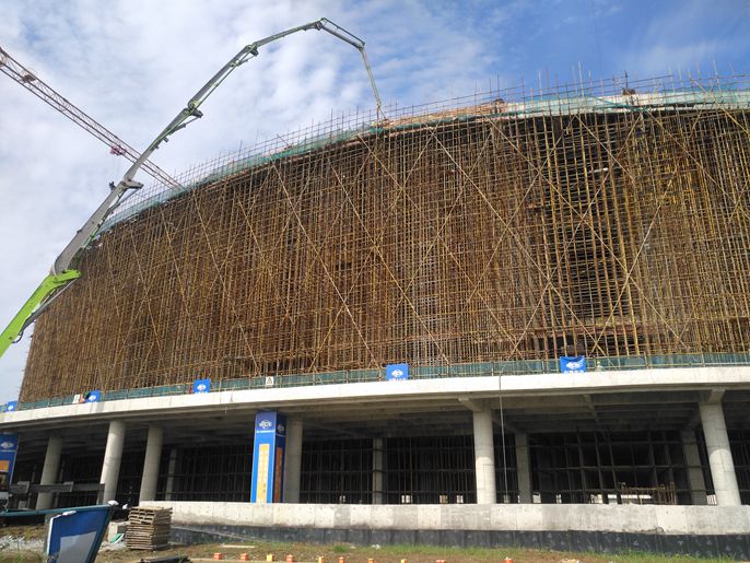 滁州市奥体中心项目位于滁州市南谯区滁州大道以东,明湖西岸半岛区域。项目总用地面积541026平方米,由“一场两馆”和周边体育公园等配套设施组成,“一场”即体育场,可容纳近4万人同时观看比赛,建筑面积为69988平方米,建筑高度为46.1米,观众坐席39222座。体育场由四部分组成,分别是东、南、西看台以及北酒店。东看台位于体育场东侧,高度为56.1米,建筑面积28886平方米。此次东看台的顺利封顶标志着奥体中心体育场主体结构即将全面完成,为后期钢结构施工打了基础。