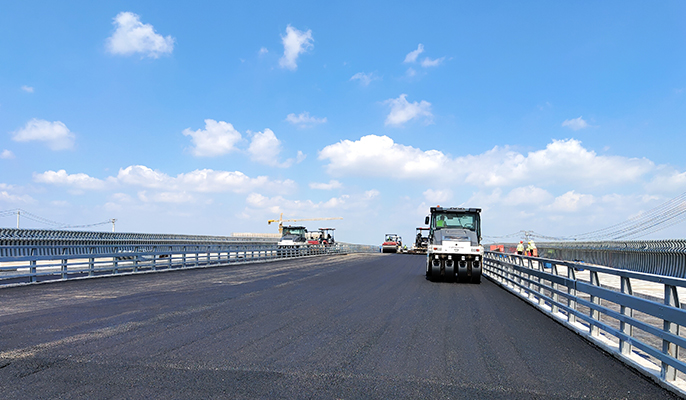 为确保顺利完成整个桥面的沥青摊铺,项目部努力克服高要求、严标准,高温酷暑等不利因素影响,精心组织、统筹规划,抢抓一切可用时间推进工程进度。严格按照图纸制定沥青摊铺专项施工方案,每周召开一次质量进度例会,加强现场质量、安全管控,对参建队伍进行安全、技术、质量等方面层层交底,安全员全程旁站监督,确保安全可控、质量达标。下一步,项目部将继续贯彻落实“项目管理提升年”相关要求,严保安全质量狠抓施工进度,确保实现项目九月底全线贯通。