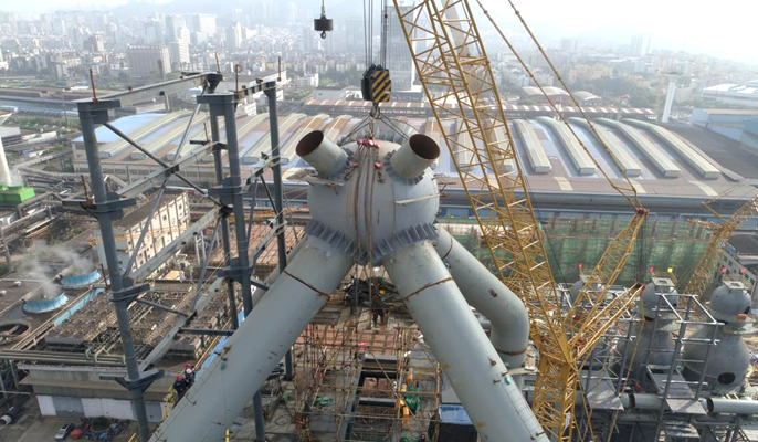 该项目位于福建省三明市三钢厂区内,冶金分公司承建1#、2#高炉主体,包含矿焦槽及上料、高炉本体、炉顶、均压煤气全回收、出铁场、粗煤气、渣处理、水处理、通风除尘等系统的土建施工、材料供货及制作安装、机电设备安装及调试、缺陷责任保修服务等。减量置换投产后,两座高炉产能可达331.8万吨/年,高炉装备水平及主要技术经济指标将达到国内先进水平。本次吊装的新1#高炉五通球,安装中心标高82.43米,直径5米,总重量约42吨,是高炉荒煤气净化处理系统的重要连接部件。