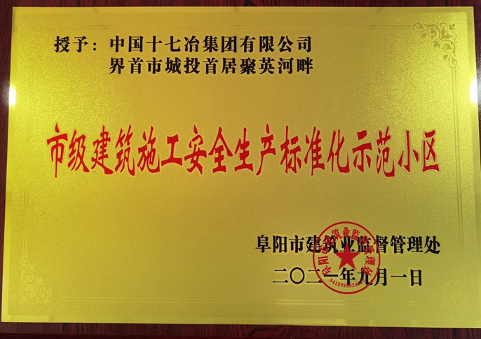 近日,阜阳市建筑业监督管理处发布《关于公布2021年第一批阜阳市建筑施工安全生产标准化示范工地(小区)名单的通知》,中国十七冶集团承建的界首城投首居聚英河畔项目被评为“市级建筑施工安全生产标准化示范小区”。