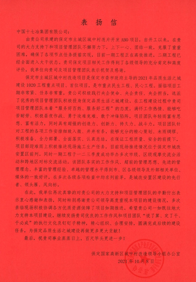 11月3日,保定国家高新区城中村改造领导小组办公室向中国十七冶集团发来表扬信,对十七冶房屋分公司保定ABO项目管理团队在项目施工建设中得到各级领导的充分肯定和高度评价给予祝贺和感谢,并授予项目负责人冯浩”先进个人“荣誉称号。