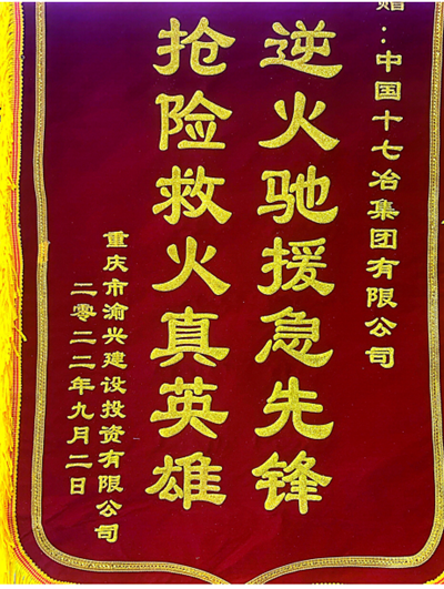 9月15日,受巴南区政府委托,重庆市渝兴建设投资有限公司总经理任良平一行将一面印有“逆火驰援急先锋 抢险救援真英雄”的锦旗及感谢信送至十七冶重庆软件与信息服务外包产业园项目部,对项目部在今年8月积极参与扑救重庆巴南区界石镇森林火灾行动表示真诚感谢。