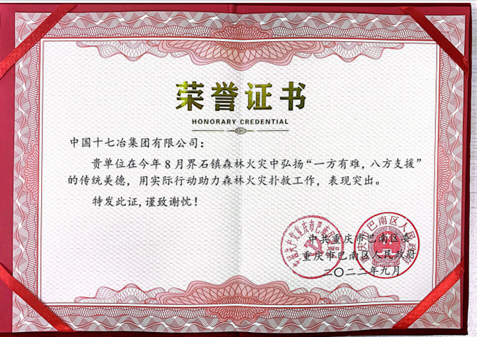今年8月25日,重庆市巴南区界石镇新玉村所辖山林一处山火死灰复燃。情况危急之下,驻扎在附近的十七冶项目部得知情况后,迅速组成一支15人的救火队伍,率先赶往起火点灭火。由于发现及时、行动迅速,经过紧张扑救,新玉村所辖山林死灰复燃山火基本被扑灭。