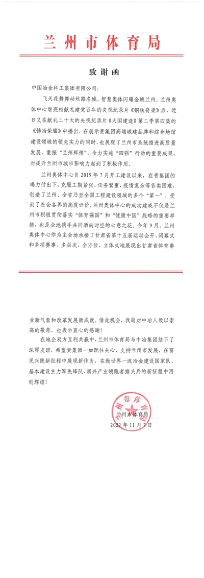 11月7日,兰州市体育局向中冶集团发来致谢函,对中国十七冶集团克服工期紧张、任务繁重等各类困难,成功建成兰州奥体中心的领先实力和日夜辛劳保障甘肃省第十五届运动会等重要活动开展做出的突出贡献,以及近日在献礼二十大的央视纪录片《大国建造》中播出的兰州奥体中心故事对提升兰州市影响力的积极作用表示诚挚感谢。