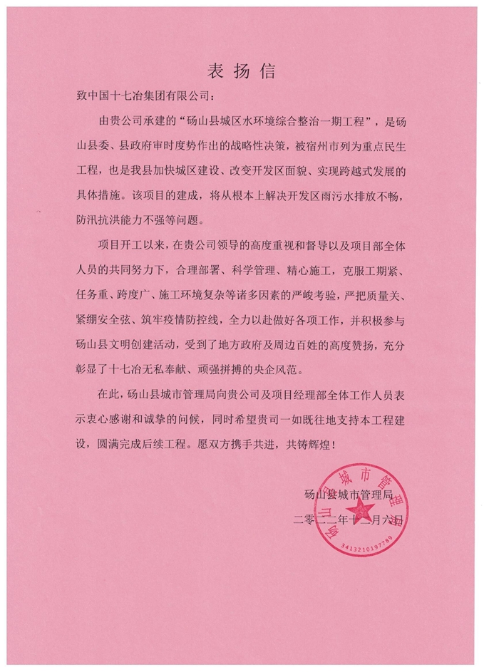 12月6日,中国十七冶集团收到砀山县城市管理局致来的表扬信,对中国十七冶南京分公司承建的砀山县城区水环境综合整治一期工程EPC项目经理部在施工中克服各种困难,优质高效地完成施工任务表示衷心感谢。