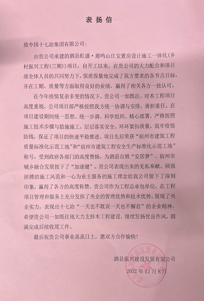 12月8日,泗县振兴建设发展有限公司向中国十七冶集团致表扬信,对南京分公司泗县鹿鸣山庄项目部在施工过程中发挥央企的管理和技术优势、为打造美丽泗县作出的积极贡献给予表扬,并表示衷心感谢。