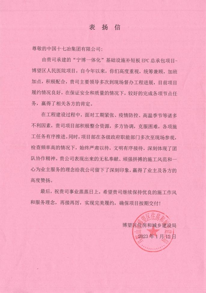 博望区住房和城乡建设局向十七冶致表扬信
