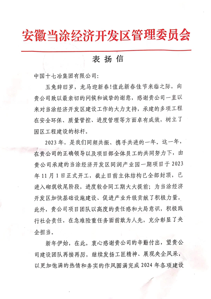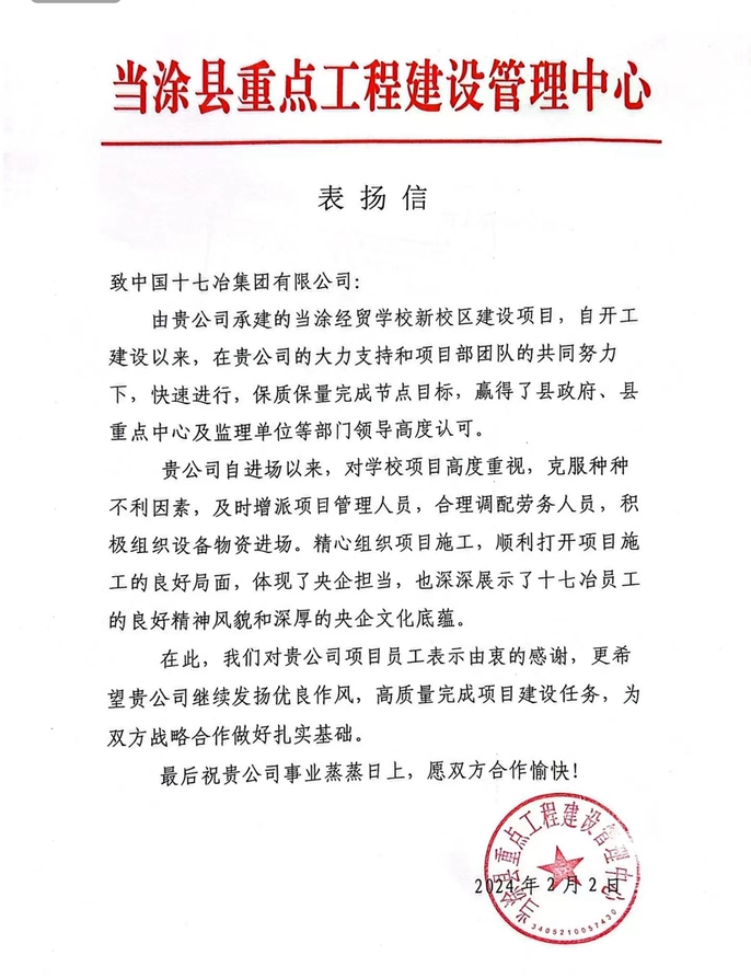 近日,当涂县教育局、县经开区管委会、县重点工程建设管理中心先后向中国十七冶集团致表扬信,对公司当涂片区项目高效完成2023年度建设任务提出表扬并致以感谢。