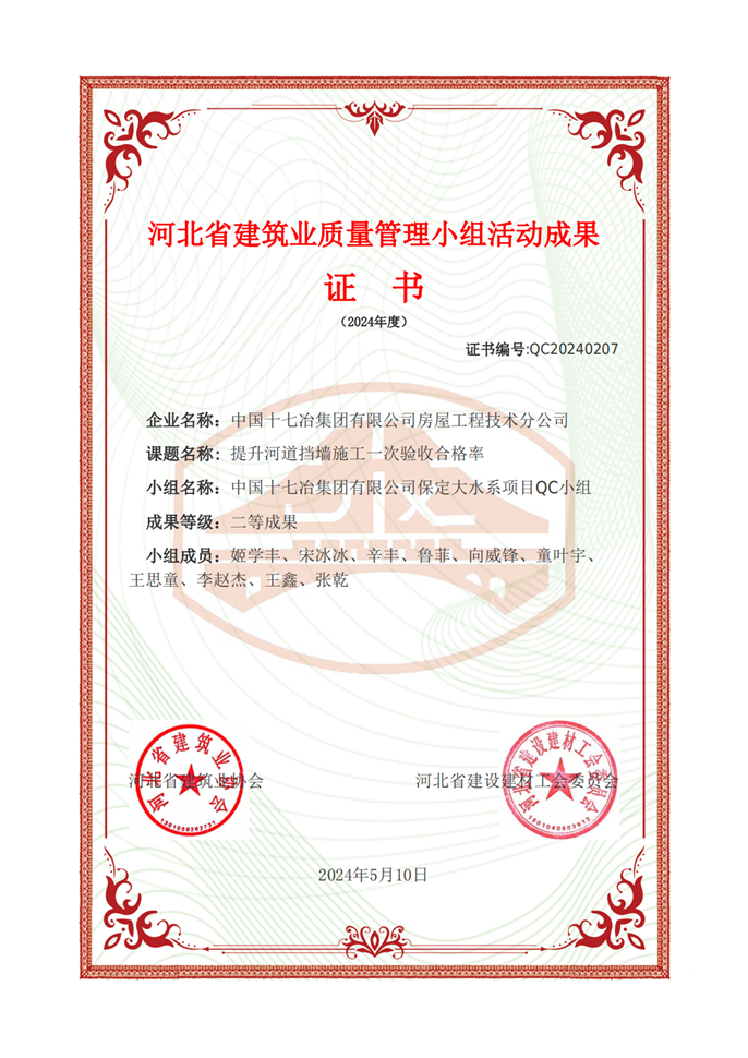 近日,从河北省建筑业协会获悉,中国十七冶房屋分公司保定市大水系建设项目部申报的《提升河道挡墙施工一次验收合格率》QC成果获评河北省建筑业质量管理小组活动二等成果。