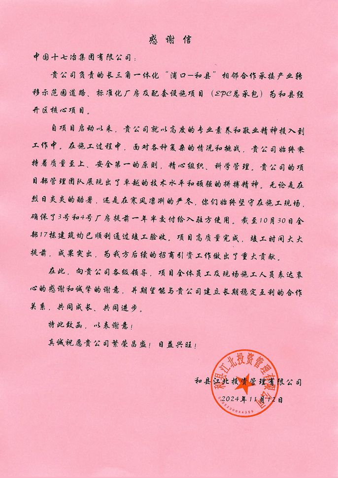 11月12日,和县江北投资管理有限公司向中国十七冶集团致感谢信,对市政分公司项目团队顺利完成和县浦和示范区道路、标准化厂房及配套设施建设任务表示感谢。