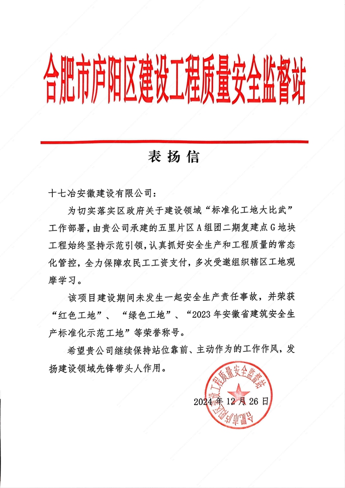 12月26日,合肥市庐阳区建设工程质量安全监督站十七冶安徽建设有限公司致表扬信,合肥五里片区A组团二期G地块项目团队精益管理,保障项目顺利推进提出表扬。