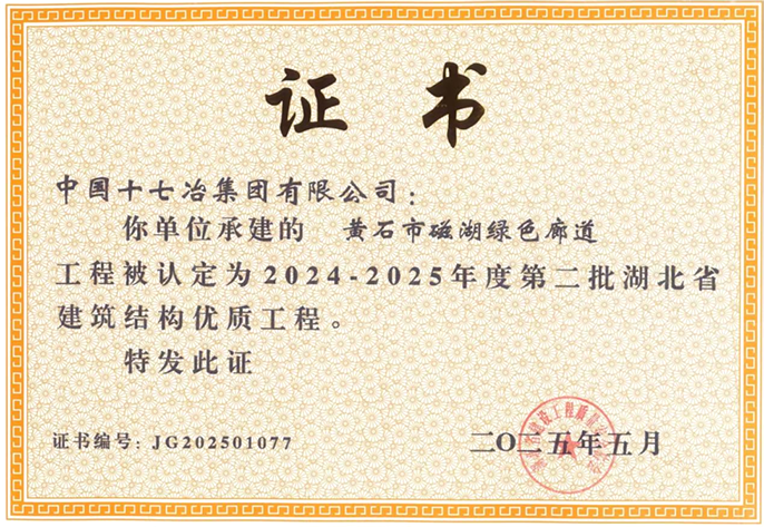 近日,中国十七冶承建的黄石市磁湖绿色廊道工程自斩获“黄石市优质结构工程”入选湖北省智能建造试点工程后,获评2024 - 2025年度第二批“湖北省建筑结构优质工程”,彰显了卓越工程品质与精益建造理念。