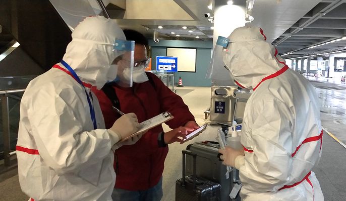 经由上海浦东国际机场前往安徽省内的境外人员约为每天200人,入境后需由安徽省包车统一送往广德、合肥两个集散点进行集中交接。彭震医师每天身着厚厚的防护服在机场待命,随时跟随包车出发。每辆包车30余人,出发前给入境人员测量体温,更换入境人员不合格的口罩,人员体检无异常后,先发车前往广德集散点交接部分乘客,再至合肥集散点交接另一部分乘客,随后跟随空车再返回上海浦东国际机场等待第二天入境的旅客。包车行驶途中若有发热人员,彭震医师随时给予检查。