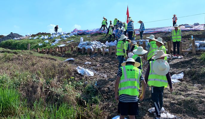 三伏天火辣辣的太阳蒸腾着大堤,热浪滚滚,即使不走动,在堤上站上几分钟,也会汗流浃背。抢险突击队员们在38℃高温闷热的环境下,挥汗如雨,拿起编织袋、铁秋,装砂石的装砂石,运沙袋的运沙袋,齐心协力,众志成城抗击洪水,和水位比高度,与洪峰比速度,不断加高加固圩堤。现场累计装运8200袋石子,堤坝加高30公分,加长300米,有效抵御了高水位的浸泡强压,防止堤坝塌方,得到政府部门的一致好评。